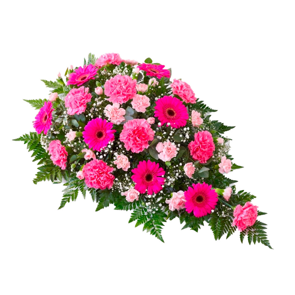 Centro compuesto por gerberas y claveles de color rosa, con follaje verde variado.