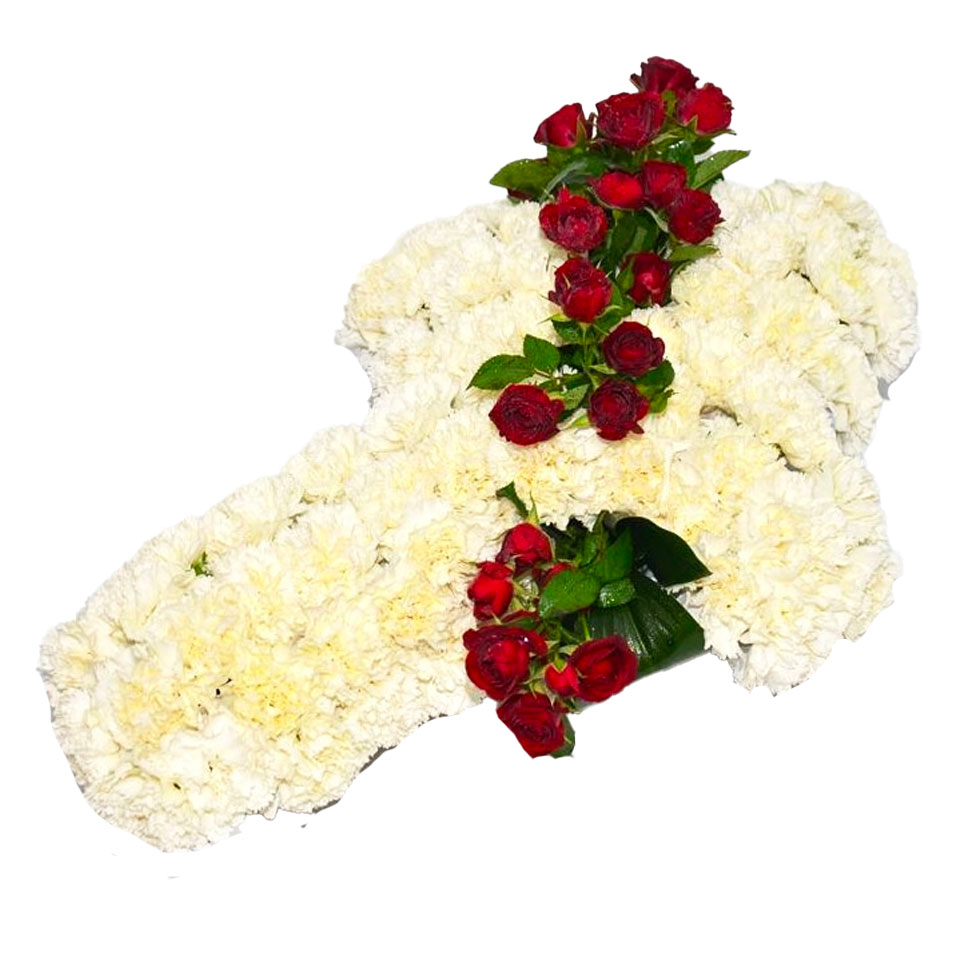 Cruz de claveles y apuntillada con rosas frescas.