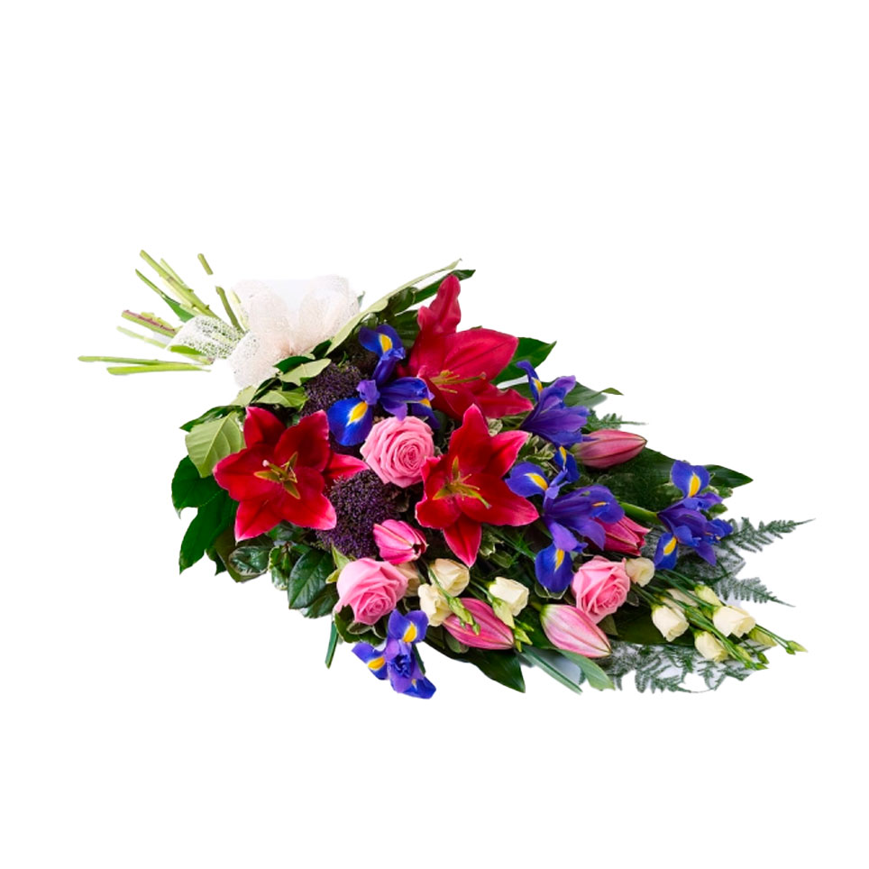 Ramo funerario se compone de flores variadas, como rosas de color rosa, iris, lirios o lisianthus.